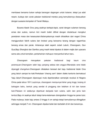 Mengenali Budaya dan Amalan kaum di Malaysia. Ciri-ciri budaya masyarakat cina di malaysia - CARA BERPAKAIAN Busana klasik kaum Cina yang asalnya berlapis-lapis sarat dengan sulaman benang emas dan sutera kini masih boleh dilihat dengan diubahsuai mengikut peredaran masa dan kesesuaian. Antara tiga kaum utama di Malaysia Cina Melayu dan India telahpun menetap di tanah ini selama 5 abad.